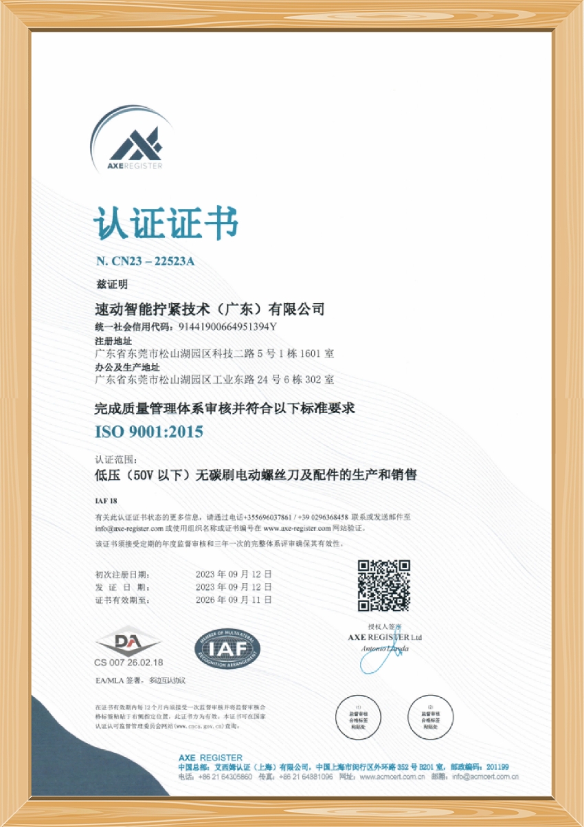 速動智能擰緊技術(廣東)有限公司。位于東莞松山湖,成立于2007年,是一家智能伺服電動螺絲刀,智能伺服擰緊軸,充電式智能扳手,工業級無刷定扭電動螺絲刀,扭矩測試儀,智能擰緊數據采集軟件及周邊配套產品的研發、生產、銷售于一體的專業性高新技術企業。