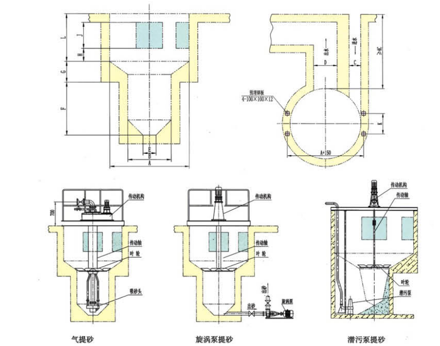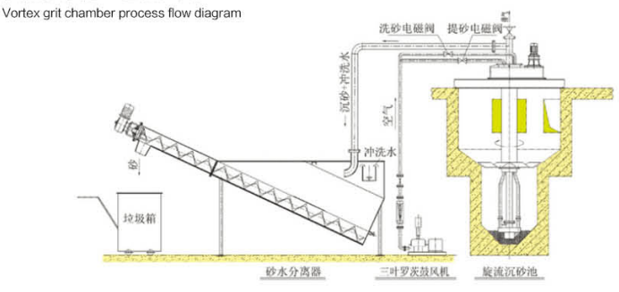 工作原理及構(gòu)造:進水從切線方向進入池中,形成旋流,軸向流攪拌機控制水流的流速與流態(tài),水流夾帶大 量粘附有機物的砂,在槳板攪拌剪切下相互剝離,砂依靠砂的自身重力和旋流作用向中 心砂斗下沉,剝離的有機物隨軸向水流向上溢走。砂斗積聚的砂經(jīng)空氣提升泵或砂泵提 升,砂與少量污水進入池外砂水分離器內(nèi),砂分離外排,污水回流至格柵井。