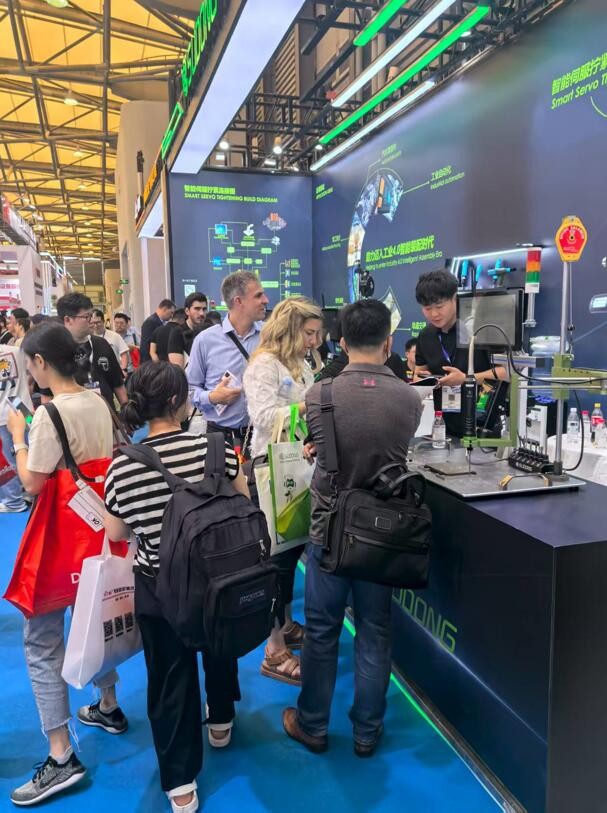 展位動態演示區通過智能伺服擰緊連接圖,清晰展示工業電腦、PLC等組件與擰緊工具的協同工作原理。此外,演示區配備的屏幕實時模擬擰緊力矩曲線與工作狀態,觀眾可直觀理解產品的智能化特性。現場工作人員介紹,該技術已成功應用于航空航天、3C電子等領域,顯著提升裝配效率與質量。